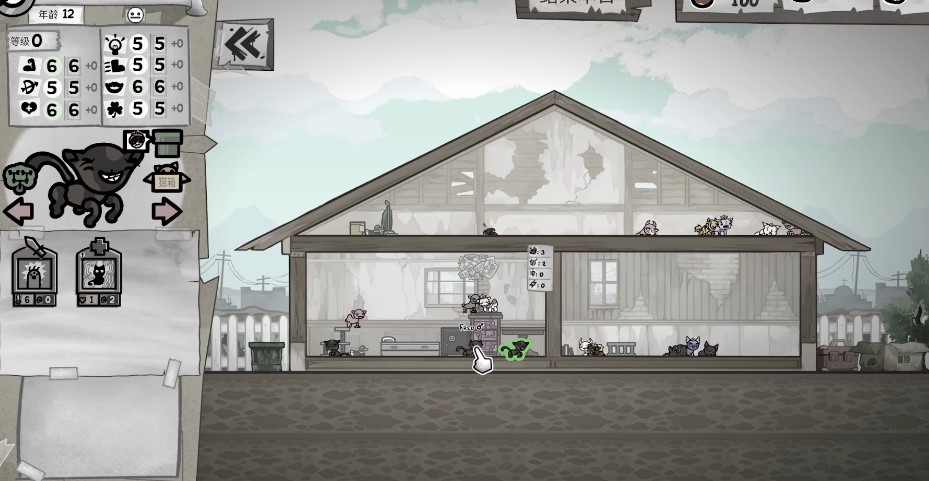 打架房把你想带出门的猫放进去,让他们互相打架,打赢的猫可以加属性,这样我们出门就有高属性的小猫哟。至于小猫被打死了怎么办,那只能说这个世界是残酷的。加气的话休息度越低越好,让他们频繁打架。这里有一个有特殊效果的家具,混沌形象,减5点休息度,强化打架的效果,让打赢的小猫加更多属性,有条件的可以装一个。